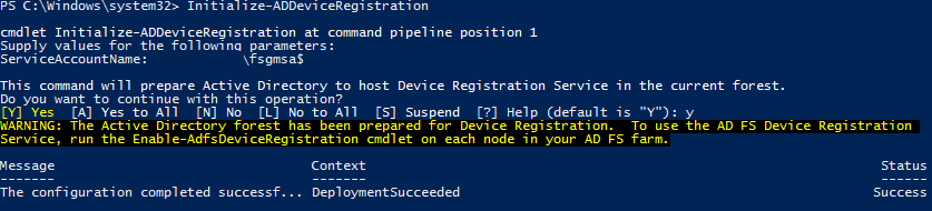 - Initialize-ADDeviceRegistration; when prompted enter the managed service account defined during the ADFS configuration step – here <your domain>\fsgmsa$