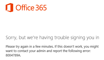 You may get the following error code – 8004789A – when logging on to Office 365 with web browser (Exchange Online OWA or SharePoint Online), while Outlook or any ActiveSync device is working fine