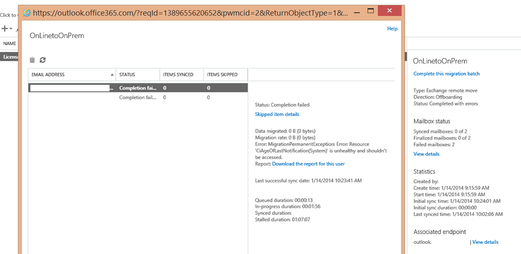 The migration batch starts and content is being synchronized between Exchange Online and Exchange On Premises and finally the job failed with the error