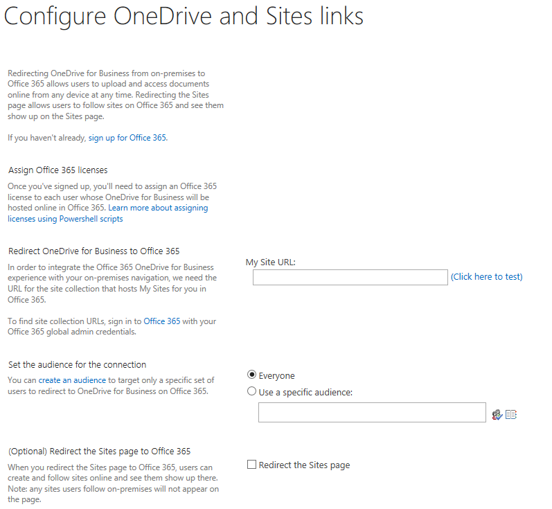 The Configure OneDrive for Business allow you to forward your users to their personal space on Office 365 instead of using the On Premises SharePoint platform; this requires of course to associate a SharePoint Online license to the user account to make it work.