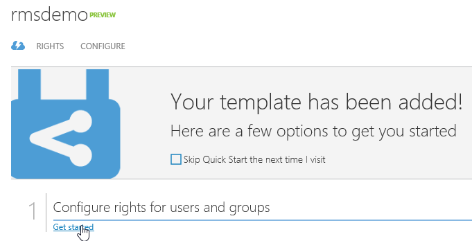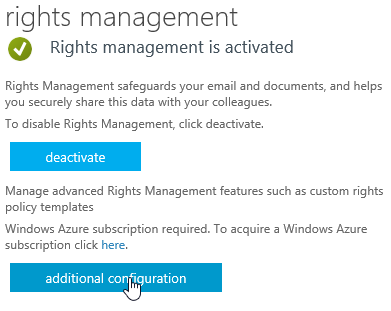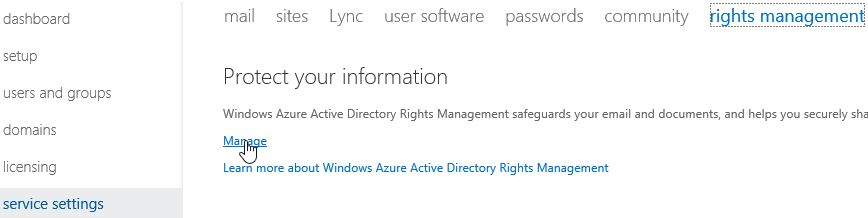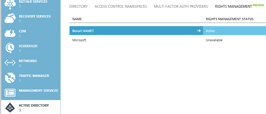 NOTE you can also go directly to the RMS configuration on Microsoft Azure from the Microsoft Azure administration portal – https://manage.windowsazure.com – and then to the Active Directory left menu