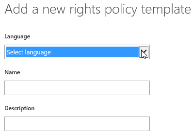 If you hit the Create a new rights policy template link (from the Wizard) or the Add button below you will be asked to choose a language, name your template and a description (this field is mandatory)
