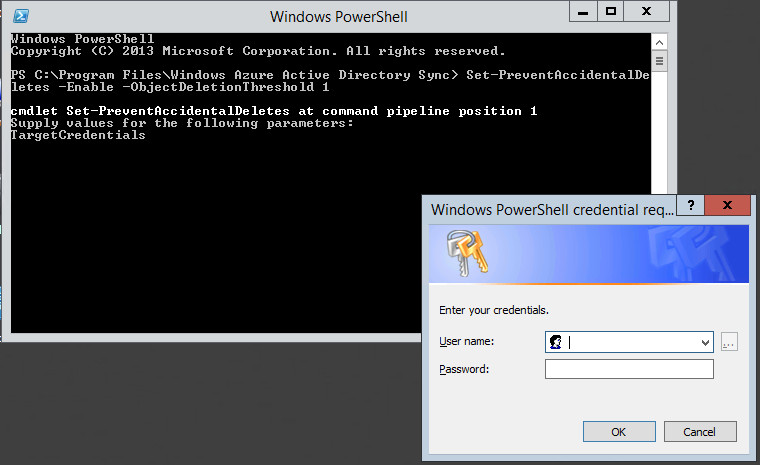 Then you will have to go to your DirSync server, open the console (miisclient.exe located %programfiles%\Windows Azure Active Directory Sync\SYNCBUS\Synchronization Service\UIShell) to check what happen. If you are happy with the deletion, just run Set-PreventAccidentalDeletes –Disable from the DirSyncConfigShell.psc1 and execute a full synchronization; if you are not happy, just restore the delete items from the directory.