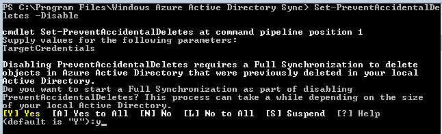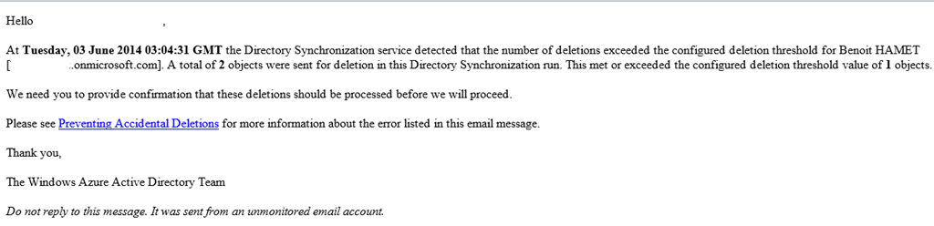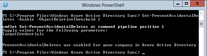 ) and execute the following command Set-PreventAccidentalDeletes -Enable –ObjectDeletionThreshold <Integer> – replace Integer with the threshold value to stop the synchronization. If the number of item reach or is bigger than the threshold, you will receive a notification email.
