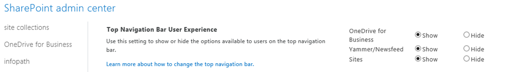This settings – called Top Navigation Bar User Experience – is available through the SharePoint Online administration center at the top of the Settings left section.