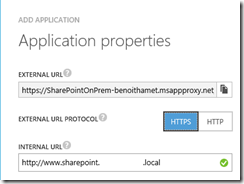 The wizard has automatically pre populated the external URL which can not be changed. Keep this URL available as it will be required to update your public DNS entry to point your published application through Azure Application Proxy instead of your On Premises reverse proxy.