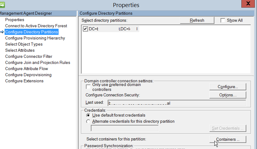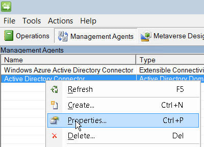 Then go to the Management Agents tab and open the properties for your Active Directory Connector