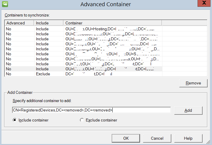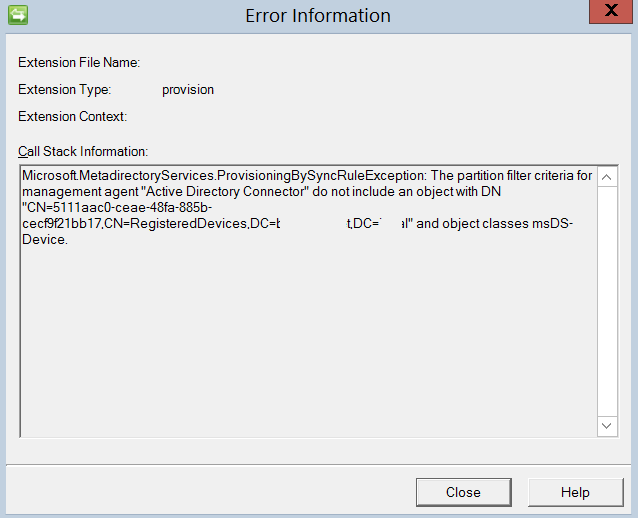 Microsoft.MetadirectoryServices.ProvisioningBySyncRuleException: The partition filter criteria for management agent "Active Directory Connector" do not include an object with DN "CN=5111aac0-ceae-48fa-885b-cecf9f21bb17,CN=RegisteredDevices,DC=<removed>,DC=<removed>" and object classes msDS-Device.
