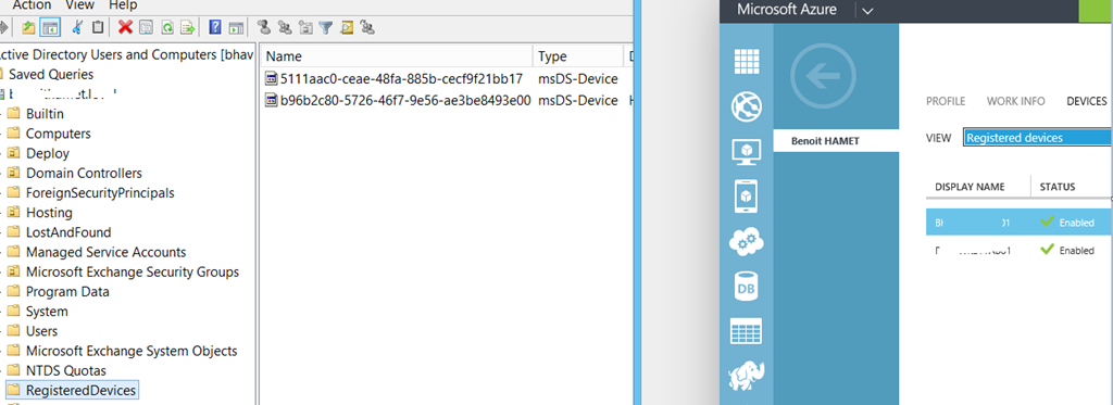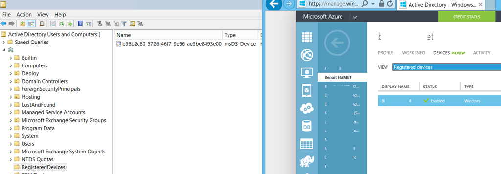 Following my previous post about this feature in preview on Azure Active Directory allowing you to set up Join Workplace / Register Devices – see http://blog.hametbenoit.info/2014/06/27/microsoft-azure-azure-active-directory-device-registration-in-preview/, I ran into an issue. Registered devices are not synched between AD and AAD; devices registered on AD do not show up on Azure portal and device registered on AAD are not synched back on AD.