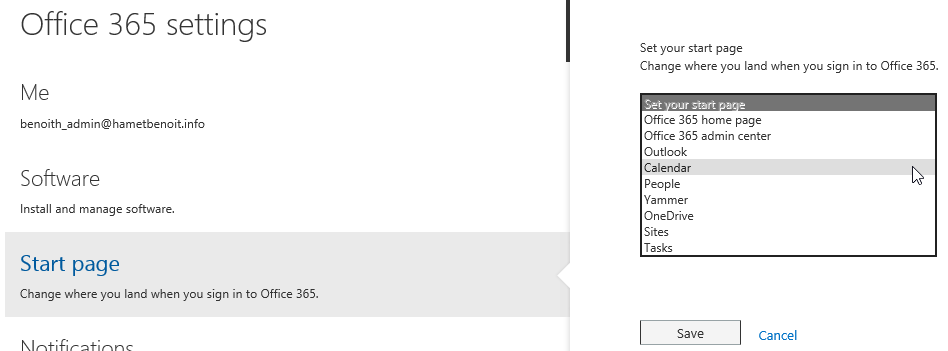 Then click on the new option called Start Page and select your start page from the Office 365 portal to Yammer, or Outlook; off course, option to choose the Office 365 admin center is only available to administrators.