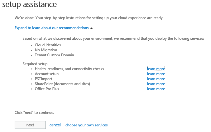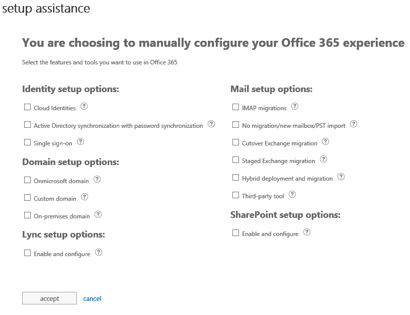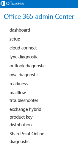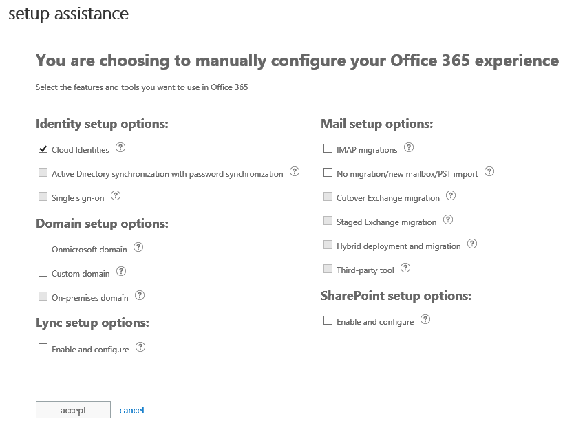 This page displays the different options/scenarios you can setup with Office 365 (from identities management to service setup).