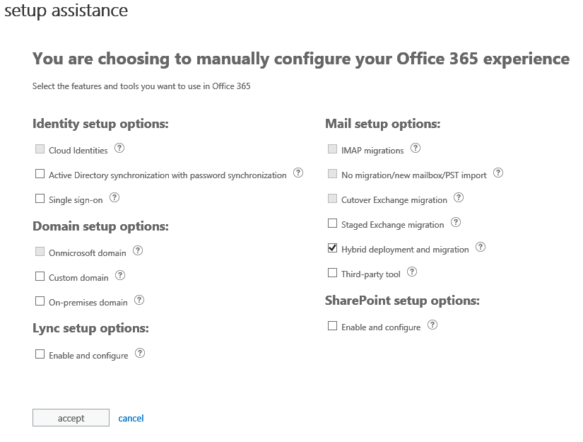 When you select a first option, it will automatically disabled options which are not compatible with your selection; you can choose your first option as you want, meaning you can select a service configuration (Hybrid deployment for your mail for example)