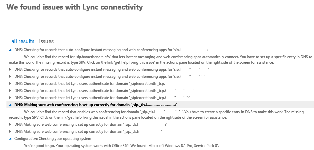 As for Lync, this option helps troubleshooting Outlook connection to Exchange Online. This is obvious but it will start to check if you have Outlook installed and his version. Checks are performed against the current Outlook profile (current connected account).