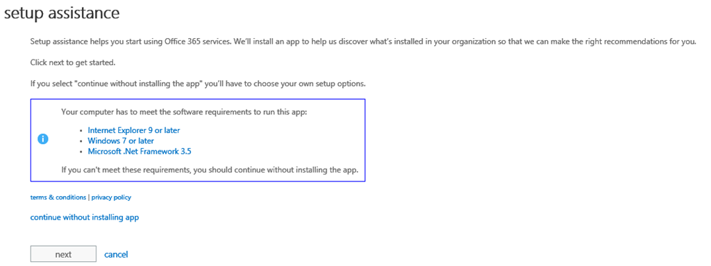 This page is assisting you in the Office 365 setup. You can install and use an App if you match the requirements or continue using a web wizard.