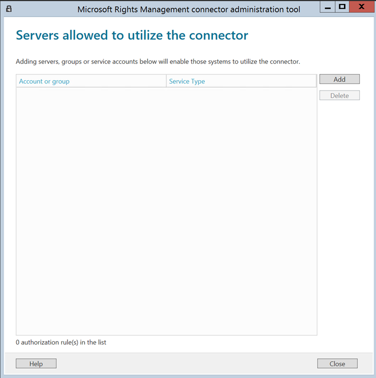 On this console, you just have to add the server(s) allowed to use the RMS connector – such as the file share server, Exchange or SharePoint server.