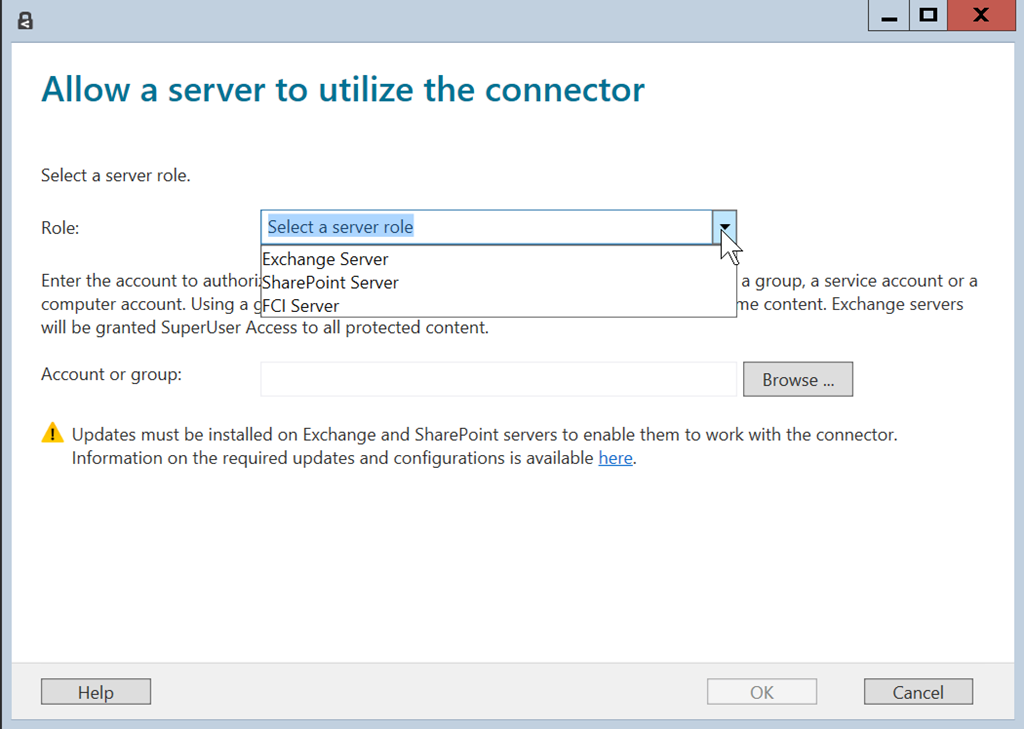 - For file servers, use the server account or a dedicated groups containing all file servers to be allowed to use the connector