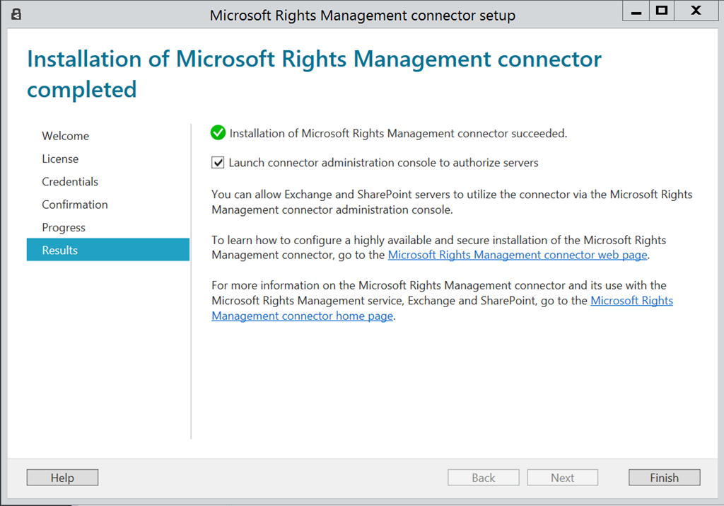 Once the connector installation has been completed, the first thing is to allow the hosting server to use the Azure RMS connector.