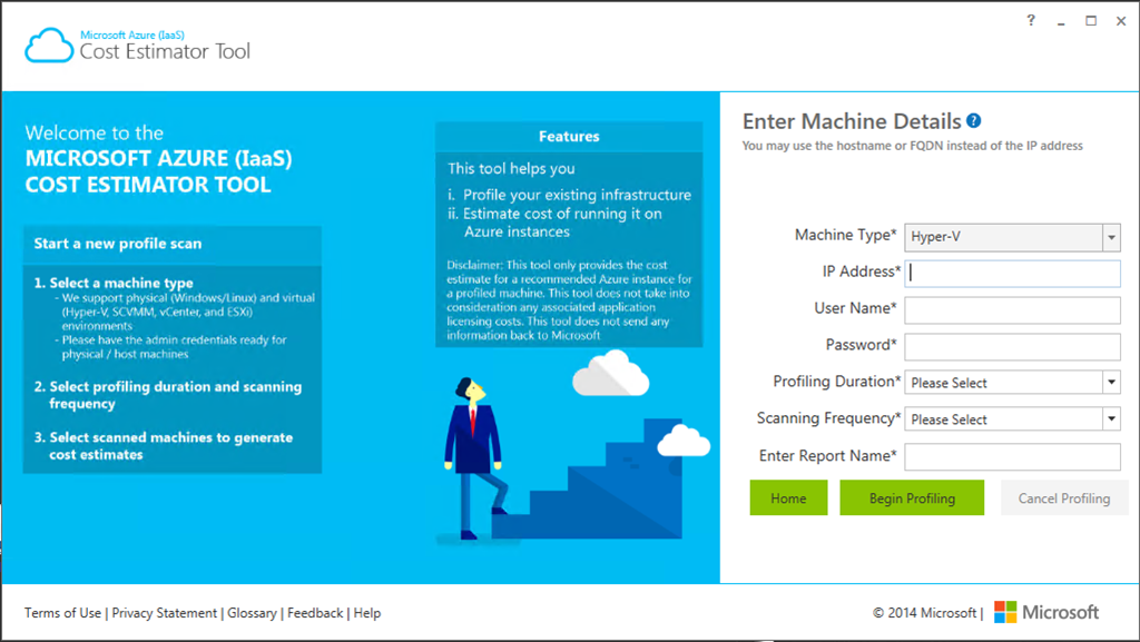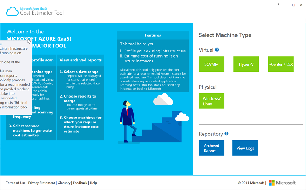 After his installation, you will be able to scan your on premises environment (running either on a physical server or an hypervisor like Hyper V, SCVVM or ESx) and get an estimation cost for the same environment on Azure