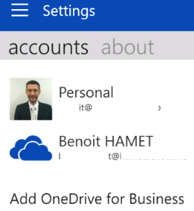 Once authenticated, your OneDrive for Business will appear in the list of available storage space as well as through the Settings\Accounts menu; as you can see, you can add more than one Office 365 OneDrive for Business space