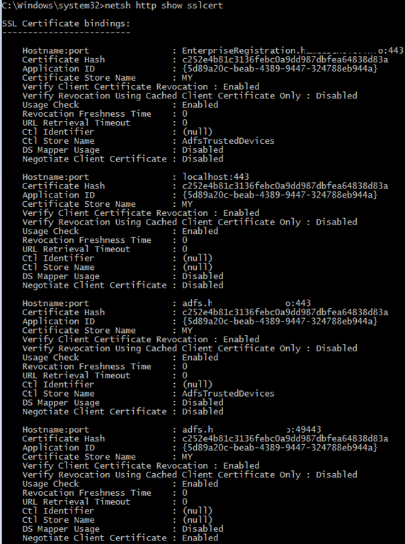 - using a command prompt (with the run as administrator), run the first command to get some values (certificate hash and application ID): netsh http show sslcert