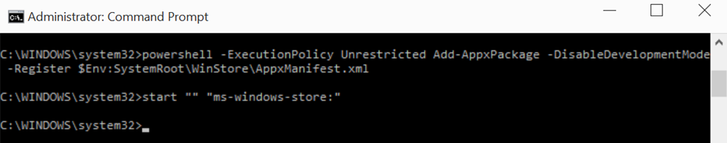 powershell -ExecutionPolicy Unrestricted Add-AppxPackage -DisableDevelopmentMode -Register $Env:SystemRoot\WinStore\AppxManifest.xml
