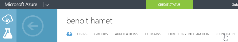 Then, from the Azure management portal (https://manage.windowsazure.com) logon using an administrator account and reach the Active Directory section, select your directory and open the Applications tab