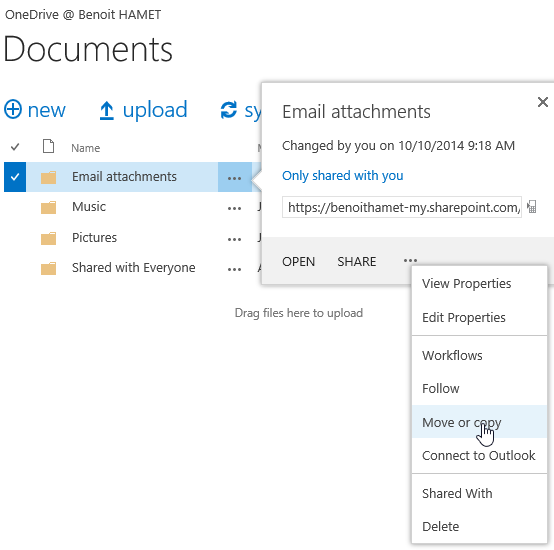 As part of these new features/services, an update on the contextual menu in OneDrive for Business now allows user to copy/move items within his own space(at this time, this option is ONLY available on OneDrive for Business, not to other SharePoint Online sites)