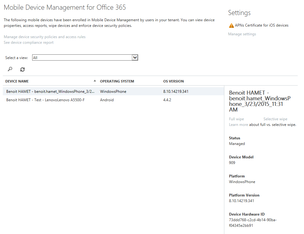 From the Office 365 admin portal you can also have a quick look of these devices and perform a wipe operation – either FULL wipe which completely reset the device or a SELECTIVE wipe which removes ONLY your corporate data (OneDrive for Business, Mail…)