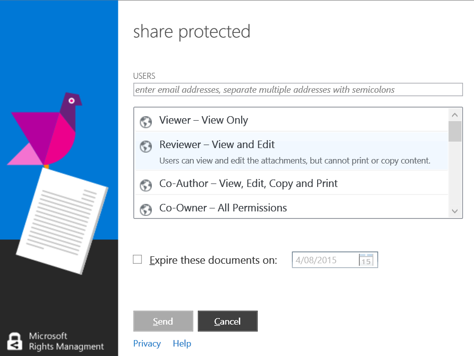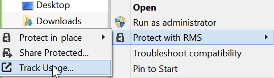 Once installed, the Share Protected button available on Office client or the Protect with RMS contextual menu on Windows Explorer will have the Track Usage option