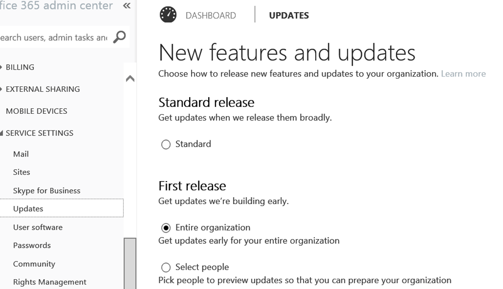 An update is currently rolling out to provide more granularity for the First Release option, letting you to target either your entire organizatoin or only selected user accounts.