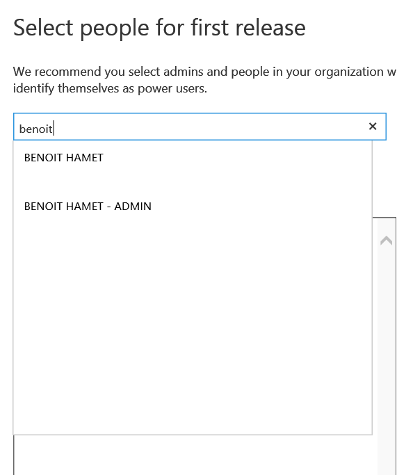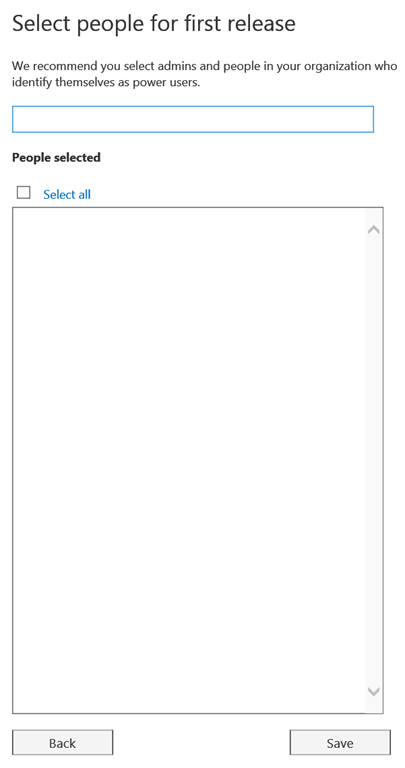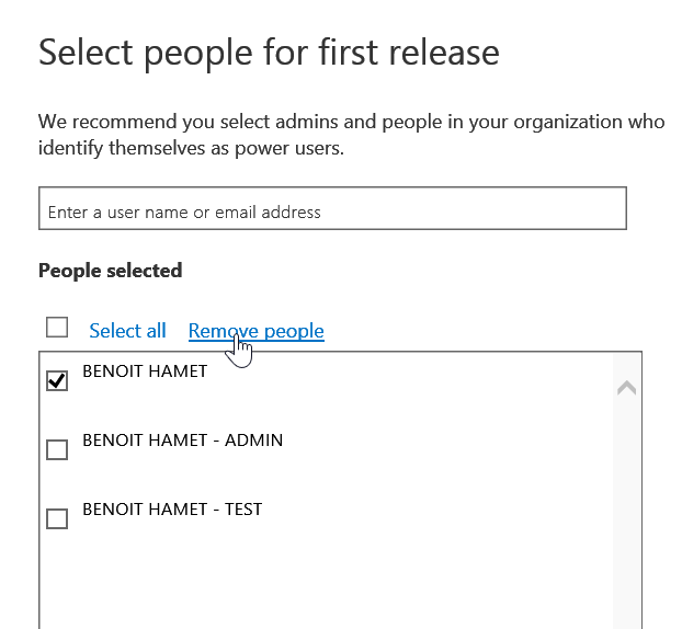 If you select the second option – Select people, you will get an additional section to select which users are selected to get the First Release. You have to enter manually the email address or the name to make account appearing