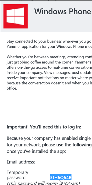 - Then you will get a temporary password to use with your directory synchronization account to configure your Yammer DirSync tool