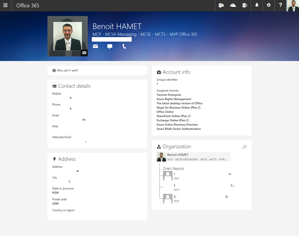 You may be already aware – if not this now the case – every user on Office 365 has a profile page (different from the SharePoint Profile) accessible from the Gear\Office 365 Settings\Me menu. This page provide user details like your contact details or allows you to know more about the license assigned to your account