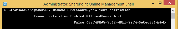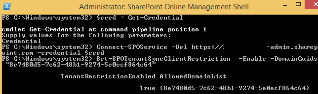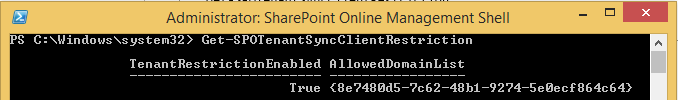 - To set the restriction you must have SharePoint Online Management Shell – available from https://www.microsoft.com/en-us/download/details.aspx?id=35588 – and execute the following command Set-SPOTenantSyncClientRestriction