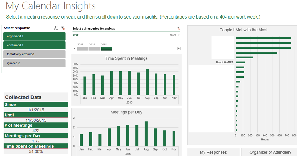 The template surfaces how much time you spend in meetings, whom you meet with the most (and whom you ignore), which part of the day you usually meet with people. You can see your calendar as a dashboard, and interact with it to drill into specific time periods, or types of meetings, you’re interested in