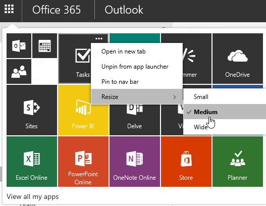 Office 365 – You can now resize the tiles on the App Launcher Leave a Comment / Office 365 / By Benoit HAMET / February 6, 2016 / Office 365, Office 365 Grid I know, this is not a major improvement but I like it as getting an App Launcher so big is quite annoying So, now you can resize (from small to large – medium is the default and the current size) your tiles