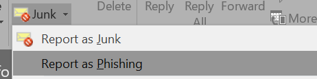 Once install, the add in is shown in the toolbar; just select the message you want to report as spam (junk) or phishing mail