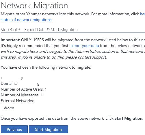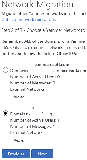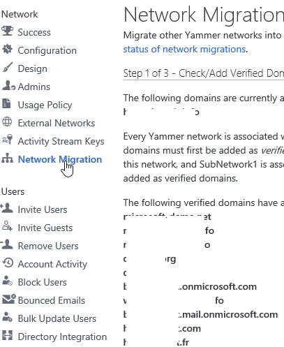 Then go to the Network Migration and check the list of domains associated with your network (you should see your primary domain used when creating your Yammer network, and the additional ones below)