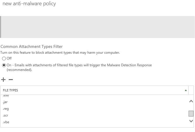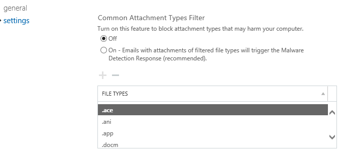 Then either edit the exiting policies or create a new one – the following screenshot has been taken while editing the default policy – and look for the Common Attachment Types Filter option available below the Settings (default is set to Off)