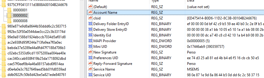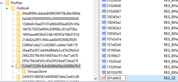 In this example, the value is 2c5e812328c4cb42bfbd2be3d360e7b3 so the subkey to search is HKEY_CURRENT_USER\SOFTWARE\Microsoft\Office\16.0\Outlook\Profiles\Outlook\2c5e812328c4cb42bfbd2be3d360e7b3