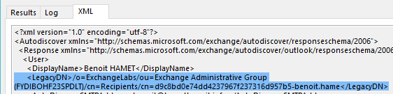 Edit this new string value with the value of your mailbox LegacyDN – you can get the LegacyDN with the Test e-mail autoconfiguration from Outlook from the XML tab