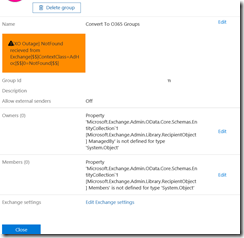 Please note it may take some time also to refresh the Office 365 Admin portal; this means you may see twice your DL/Office 365 groups – one distribution list and one Office 365 Groups; if you try to select the former distribution group you will got an error ![]()