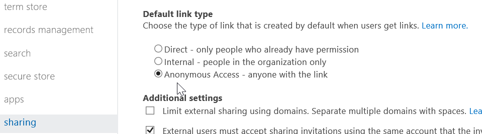 Now, SharePoint Online administrators can define which sharing link type (direct, internal or anonymous – again depending of the sharing configuration settings defined) will be the default option.