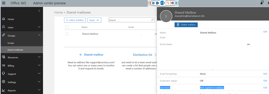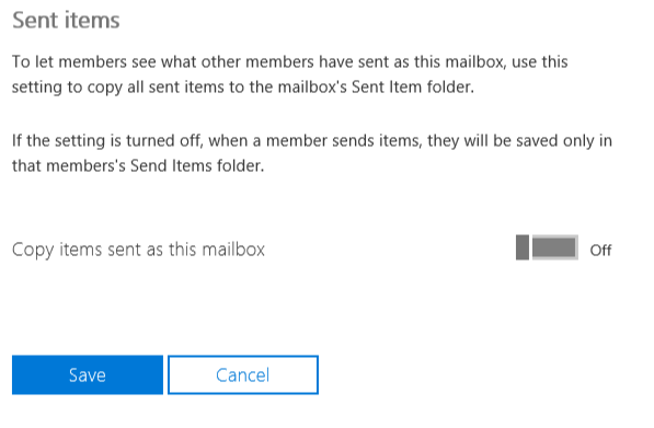 Now, for Exchange Online you can use the Office 365 Administration Portal to enabled/disable this feature. Just logon to your Office 365 Administration Portal – not Exchange Online Control Panel – and browse to Groups\Shares Mailboxes to select the Shared Mailbox you want to manage. The setting will be available in the Property pane