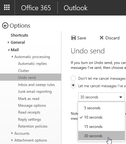 To enable this new feature, logon to Outlook on the Web (formerly known as Outlook Web Access) and go to your settings to reach the Mail\Automatic Processing\Undo sent and select the time to allow the cancellation.