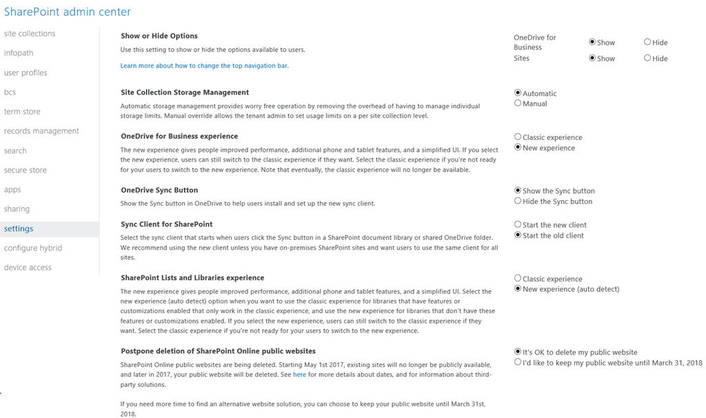 To postpone the public website deletion, go to your SharePoint Online administration portal and reach the Settings section and select I’d like to keep my public website until March 31, 2018