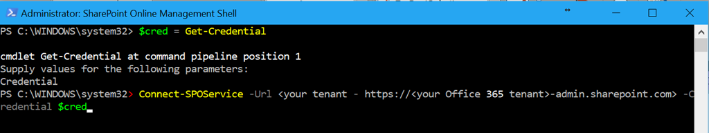 - Open a SharePoint Online PowerShell command prompt and connect to your tenant (Connect-SPOService -Url <your tenant – https://<your Office 365 tenant>-admin.sharepoint.com> –Credential (Get-Credential))