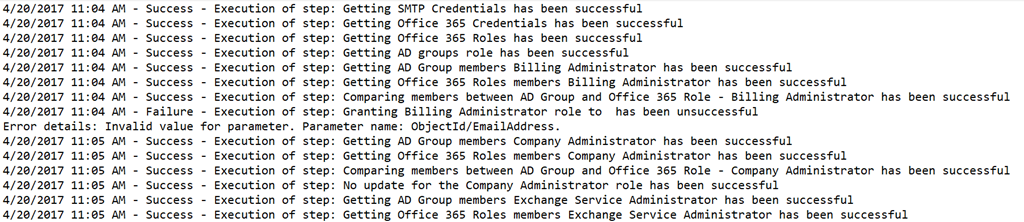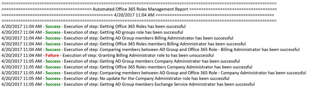 The script is comparing Active Directory group membership with the corresponding Office 365 Role, excluding online account added to the Office 365 role. If there is any difference, the script will automatically grant or revoke role membership based on the AD group.