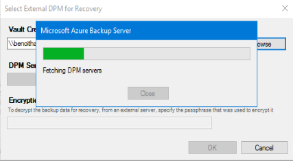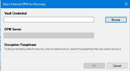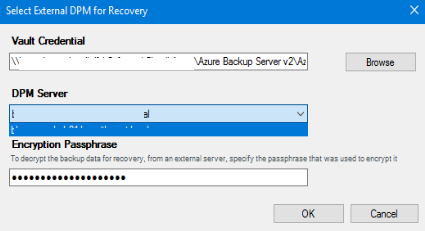 - When clicking to the Add External DPM you will be asked to select the vault credential; just browse to the location you have saved the credentials file downloaded earlier and enter the passphrase you have defined when creating the Azure Recovery Vault