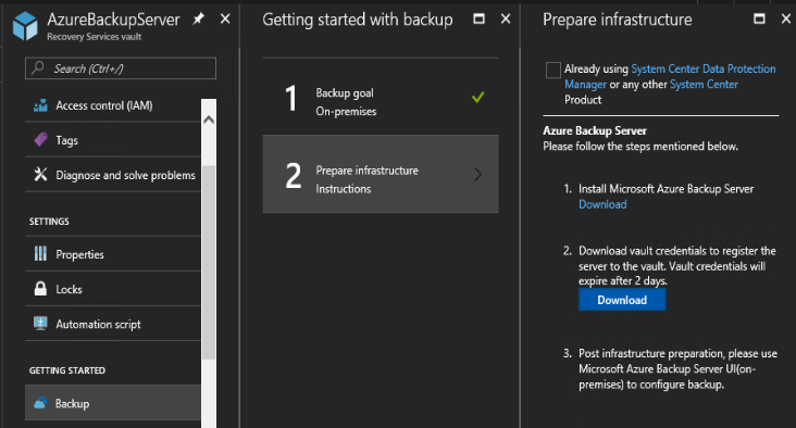 - First you need to re download the credentials file as the one you used to configure MABS may have expired; from the Azure Portal (https://portal.azure.com) access your Recovery Vault and go to the Getting Started\Backup section to define (again) the goal (backup on premises) and then being able to download the vault credentials
